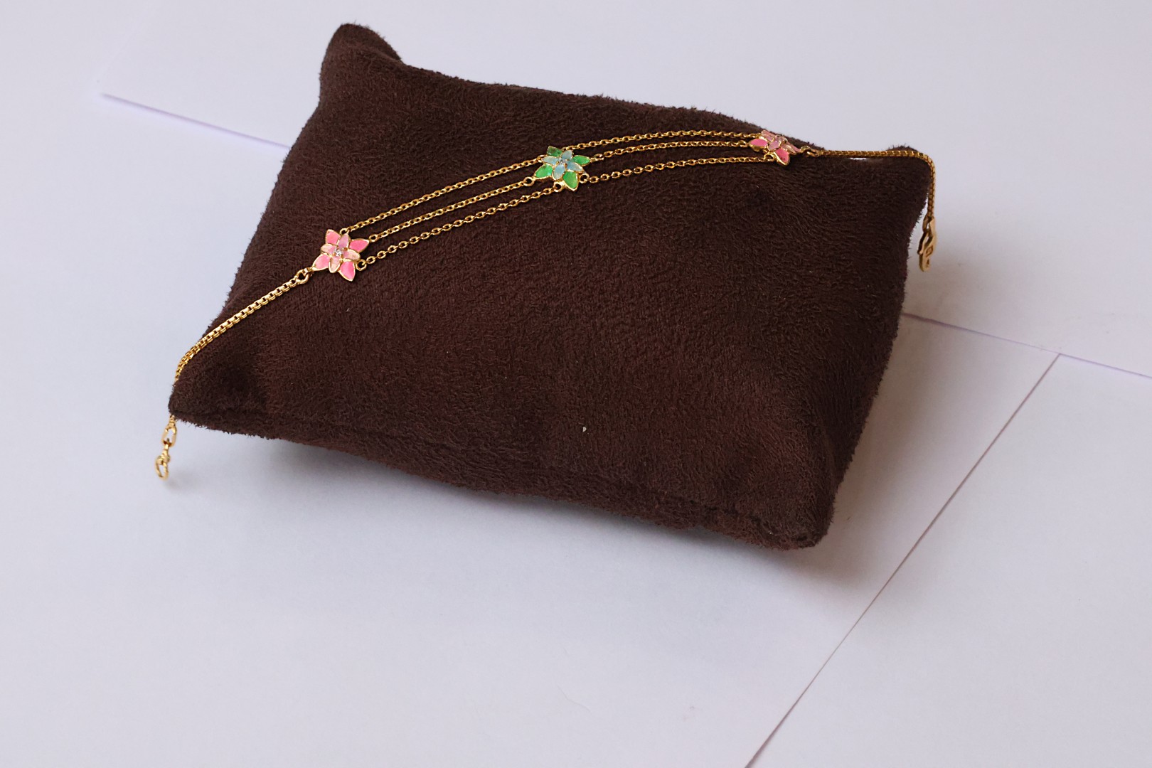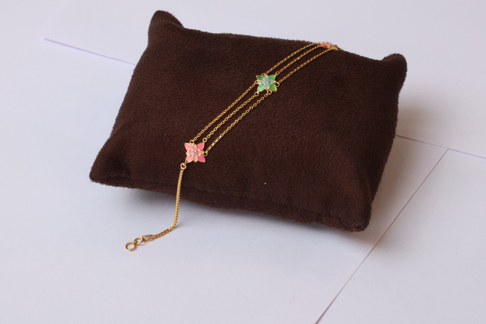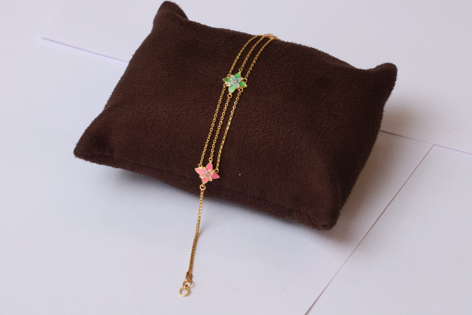 The Triple Layer Enamel Flower Charm Gold Bracelet is a celebration of color, texture, and floral artistry. Designed with three layered chains, each adorned with enamel-coated flower charms, it creates a cascading effect that adds dimension and movement.